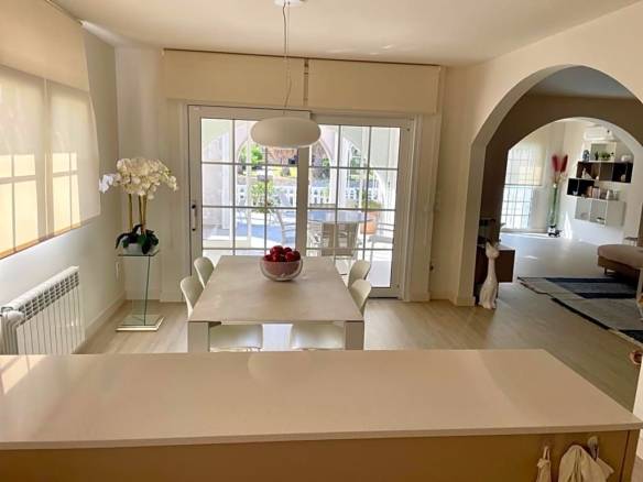 Distribuida en dos pisos, la planta baja le da la bienvenida con un gran hall de entrada que conduce a la espaciosa sala de estar, integrada a la perfección con una cocina americana. Salga a la generosa terraza, donde puede tomar el sol, disfrutar del área del jardín, darse un refrescante baño en la piscina y deleitarse en la zona de bronceado de 12,5 m. Adicionalmente, dos dormitorios y dos baños en este nivel proporcionan cómodas acomodaciones.